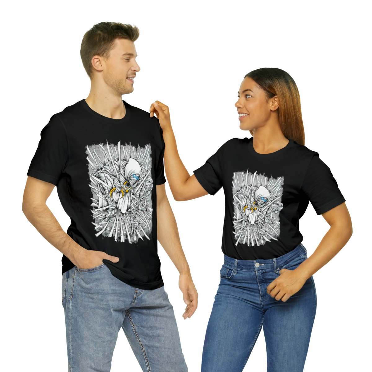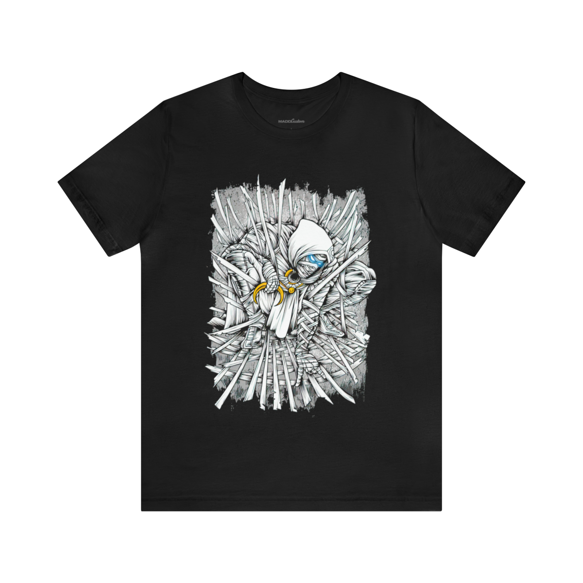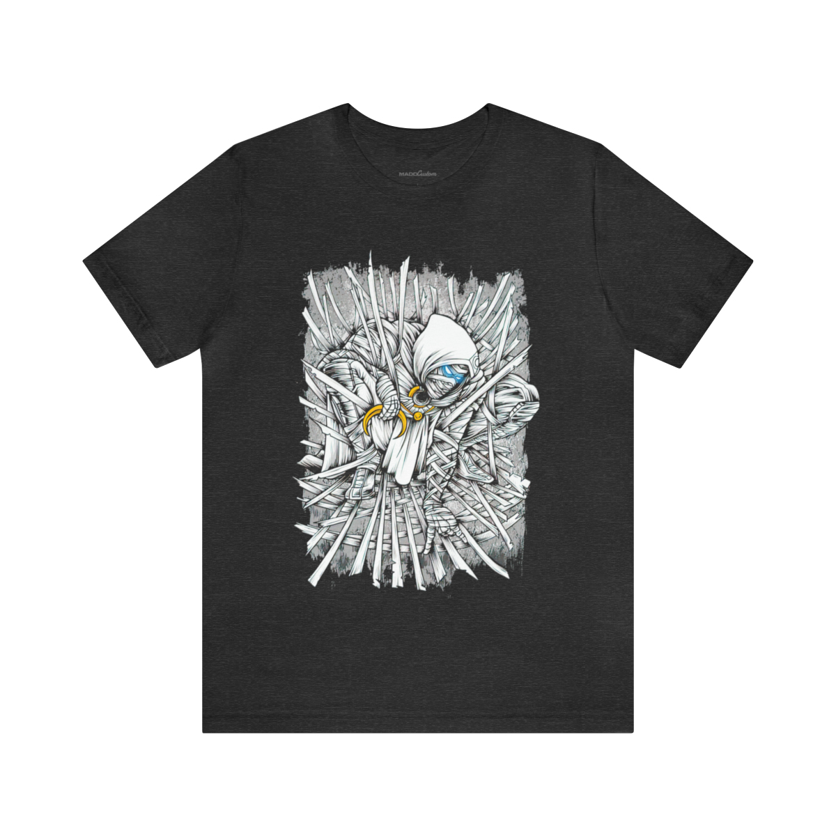 Our t-shirt showcases Moon Knight, wrapped in linen bandages, echoing his mysterious persona. Meanwhile, Spider-Man is depicted bound in intricate webs, symbolizing his connection to his arachnid powers. The design captures the essence of their individual struggles and the convergence of their destinies.