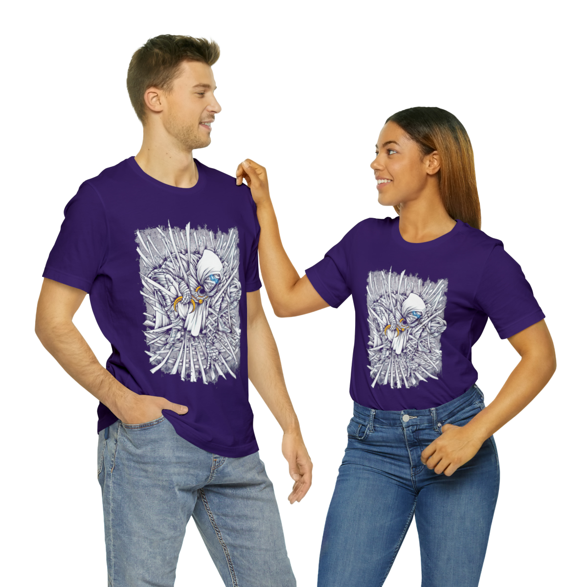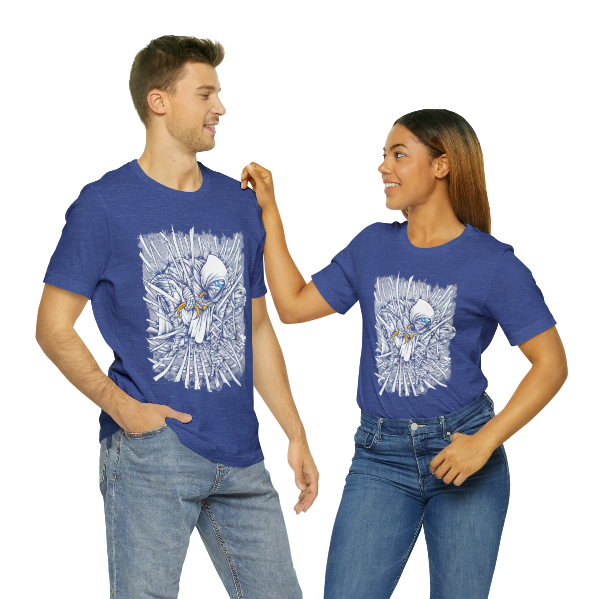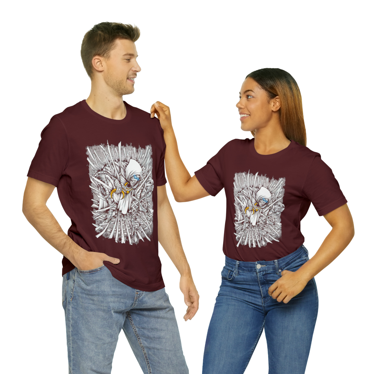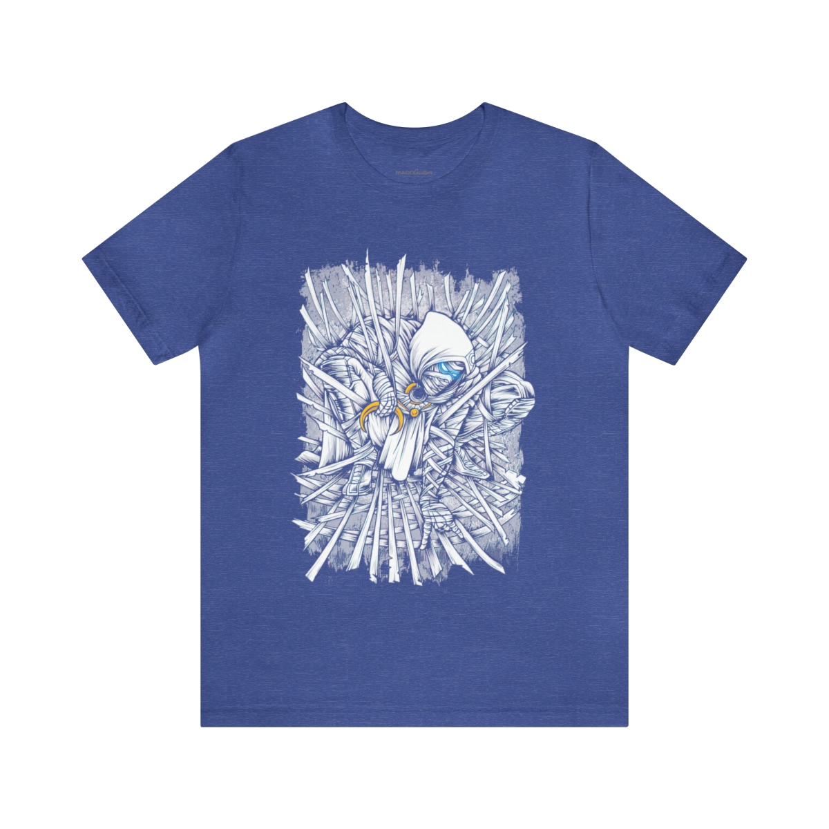 Our t-shirt showcases Moon Knight, wrapped in linen bandages, echoing his mysterious persona. Meanwhile, Spider-Man is depicted bound in intricate webs, symbolizing his connection to his arachnid powers. The design captures the essence of their individual struggles and the convergence of their destinies.