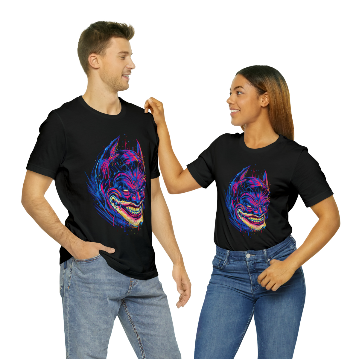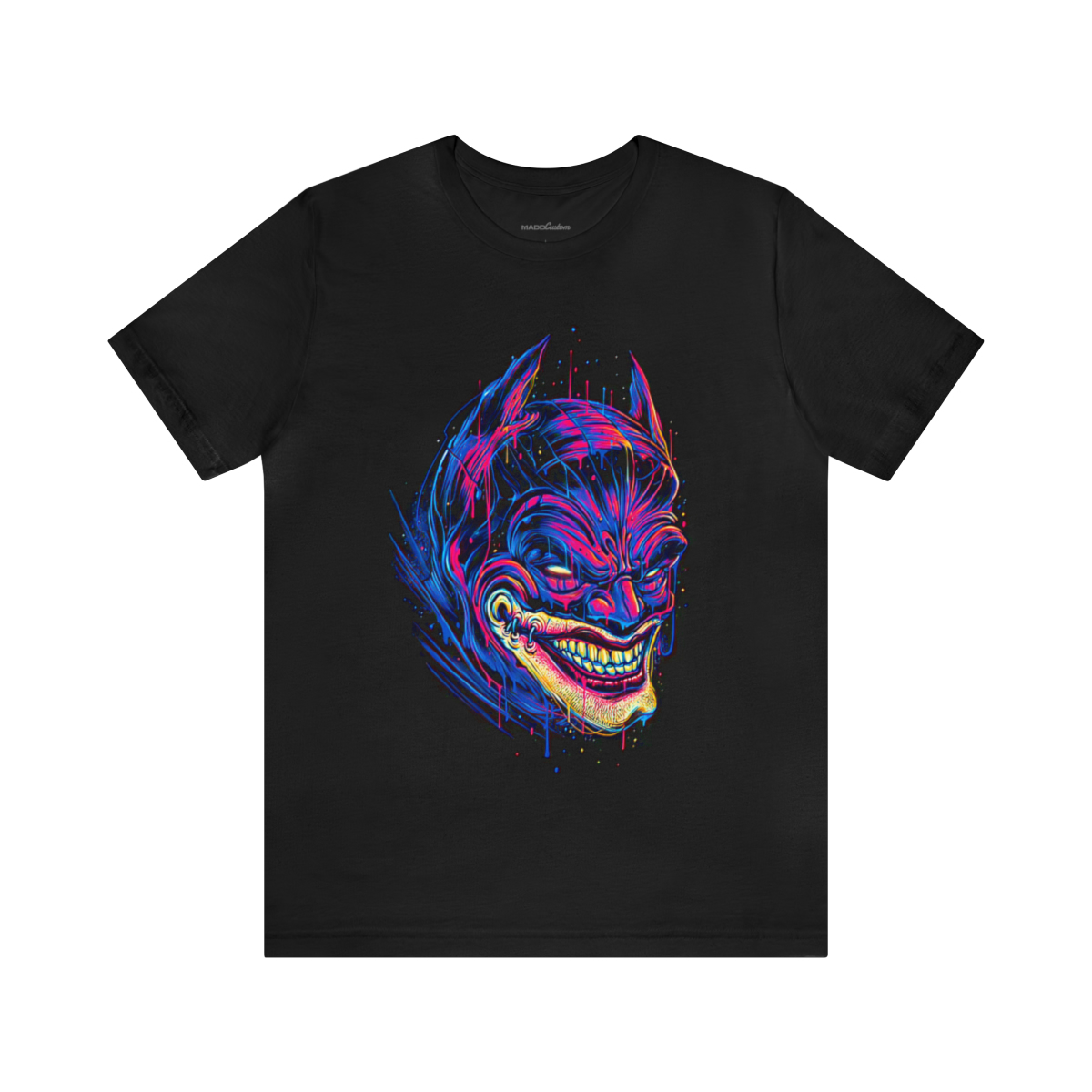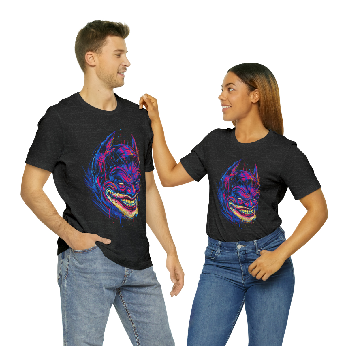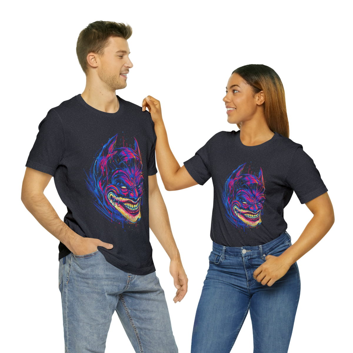 Our t-shirt showcases the Joker wearing the menacing Batman mask, creating a visually striking and thought-provoking image. The design captures the Joker’s complex nature, combining his maniacal grin with the symbol of the Dark Knight, creating an unsettling juxtaposition that reflects his unpredictable and anarchic personality.
